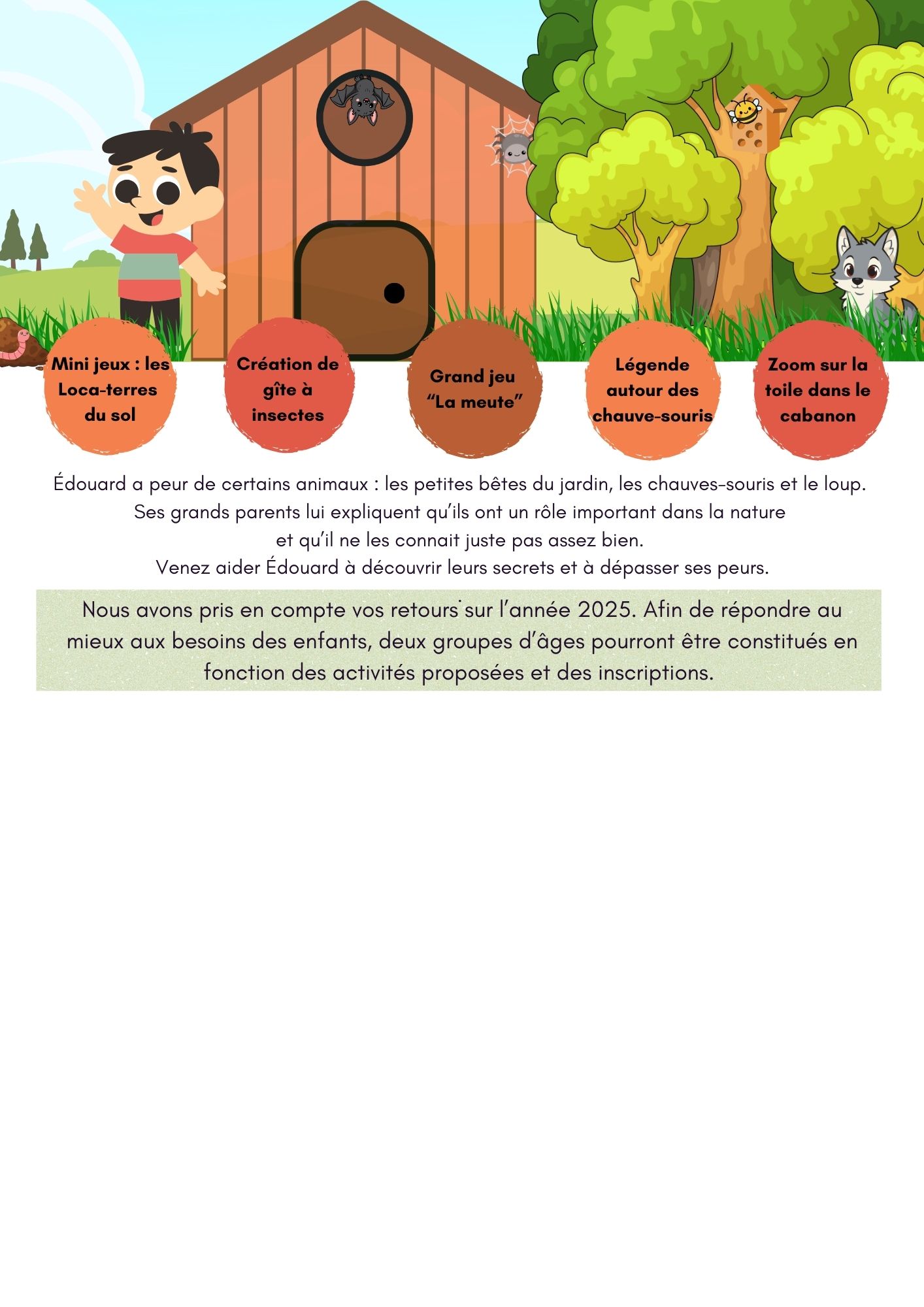 Édouard a peur de certains animaux : les petites bêtes du jardin, les chauves-souris et le loup.